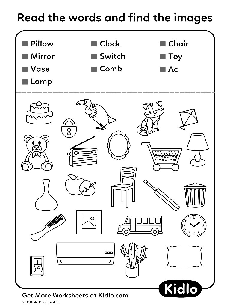 Get ready to match. Teach your child how to match the words to its pictures with the help of this worksheet. This worksheet will help the child to identify the picture from a bunch of other pictures by reading the words. It will build their visual discrimination skills. 20 printable worksheets to make learning experience enjoyable for your child! 😊